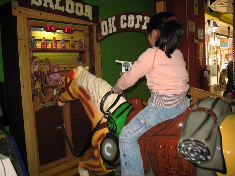 A diferencia de los pinbols de mi adolescencia, en donde muchas veces te pedían mostrar la boleta militar, las salas de juegos de ahora tienen opciones para todas las edades. Vi chiquillas bailando los pasos que la pantalla les marcaba (alguna con su mamá); también muchachos jugando a las carreras en unas enormes motos o boxeando; y también niños pequeños como mi hija que se divertían en el carrusel, en autitos musicales o montando un caballo falso y disparando virtualmente a unas botellas que se caían con gran estrépito.