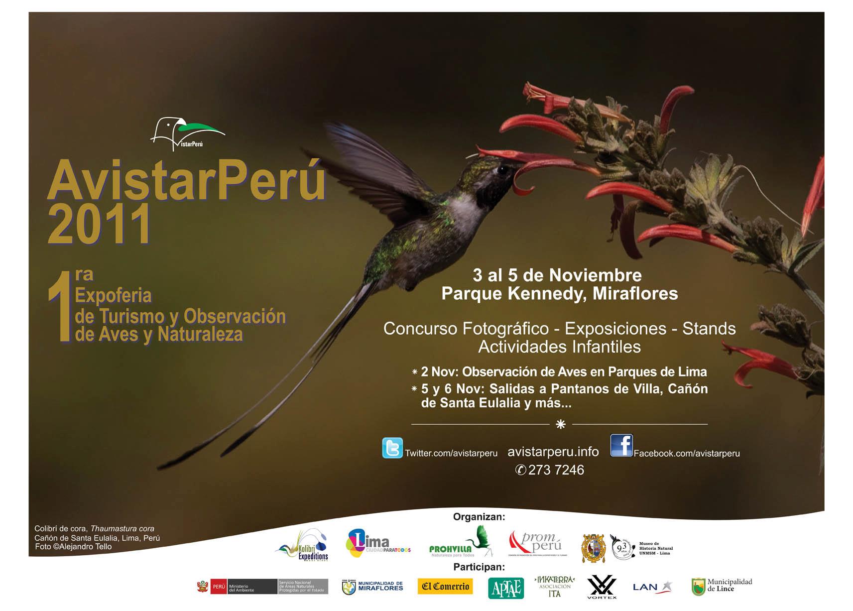 La próxima semana se inaugura AvistarPerú 2011, cuyo evento central es la Expoferia del Parque Kennedy de Miraflores del 3 al 5 de noviembre: el evento busca convertirse en un espacio anual de difusión y educación ambiental, partiendo de uno de los elementos más emblemáticos del patrimonio natural del país: las aves. El tema de este año es “Aves del Departamento de Lima”.